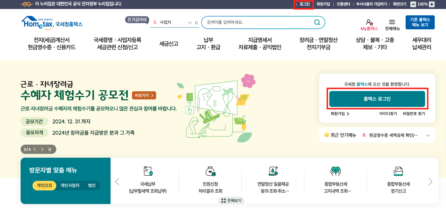 1. 국세청 홈택스 접속 : 먼저 국세청 홈택스 사이트에 접속합니다.
